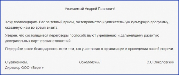 5. Краткий итог и выводы. В самом конце можно подвести итог всего вышесказанного. Однако, сделать это очень кратко не всегда удается. В таком случае, писать в несколько предложений то, что вы и так описали в первых двух абзацах, не стоит. Помните, что лучший друг делового письма – это краткость. Поэтому в большинстве случаев достаточно ограничиться фразами «Надеюсь на успешное сотрудничество», «Жду Вашего ответа по данному вопросу» и так далее.