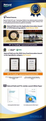 Natural Field received multiple international awards for its NF Co-loading® liposomal CoQ10 and Curcumin, highlighting its breakthroughs in stability, absorption, and application innovation.