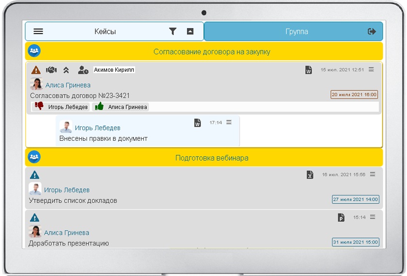 Функциональность приложения позволяет создавать задачи, события и комментарии к ним непосредственно в чатах группы на вкладке «Группа». Задачи могут быть иерархическими и содержать подзадачи, события, документы, списки исполнителей, сроки исполнения, сообщения. Такие наборы взаимосвязанных задач и событий образуют кейсы. Сообщения могут содержать файлы документов, которые загружаются участниками группы для ознакомления и согласования с другими участниками.