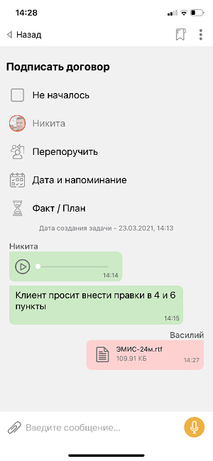 А еще в обновленной версии программы вы можете создавать задачи внутри приложения голосом и обсуждать детали поручения во встроенном в каждую задачу чате в виде голосовых сообщений — прямо как в мессенджерах.